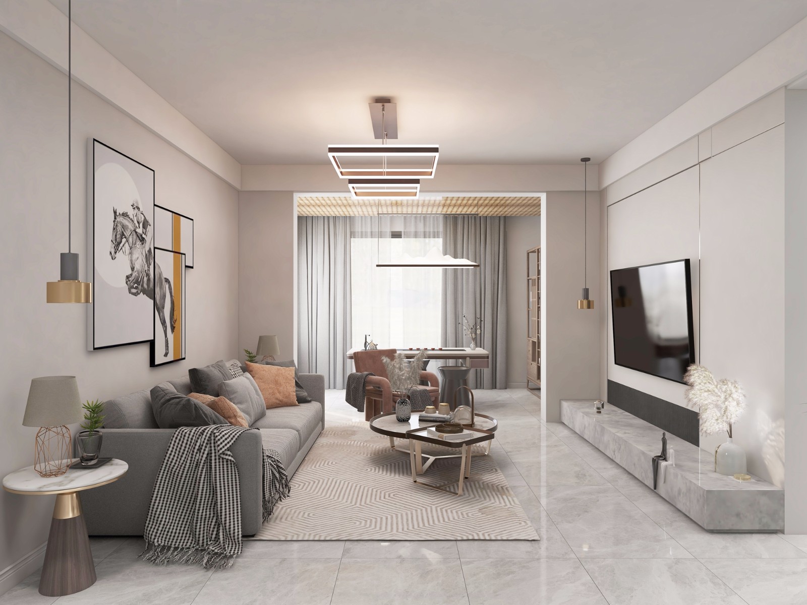 客厅:客厅打通之后格外显大,色调偏暖,背景墙线条设计增加层次感