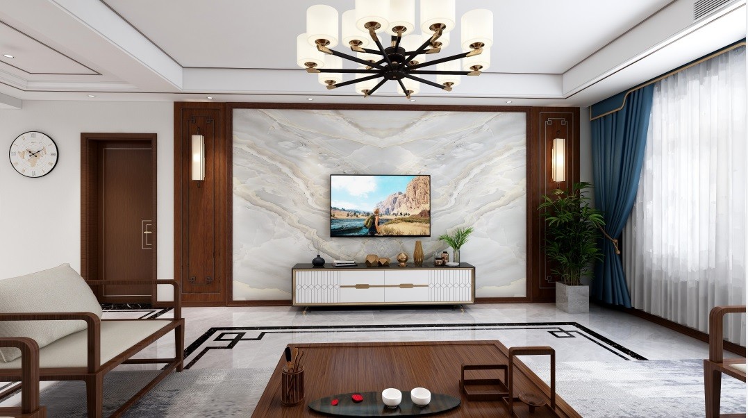 由岩板和木饰面结合突出中式的精雕细琢