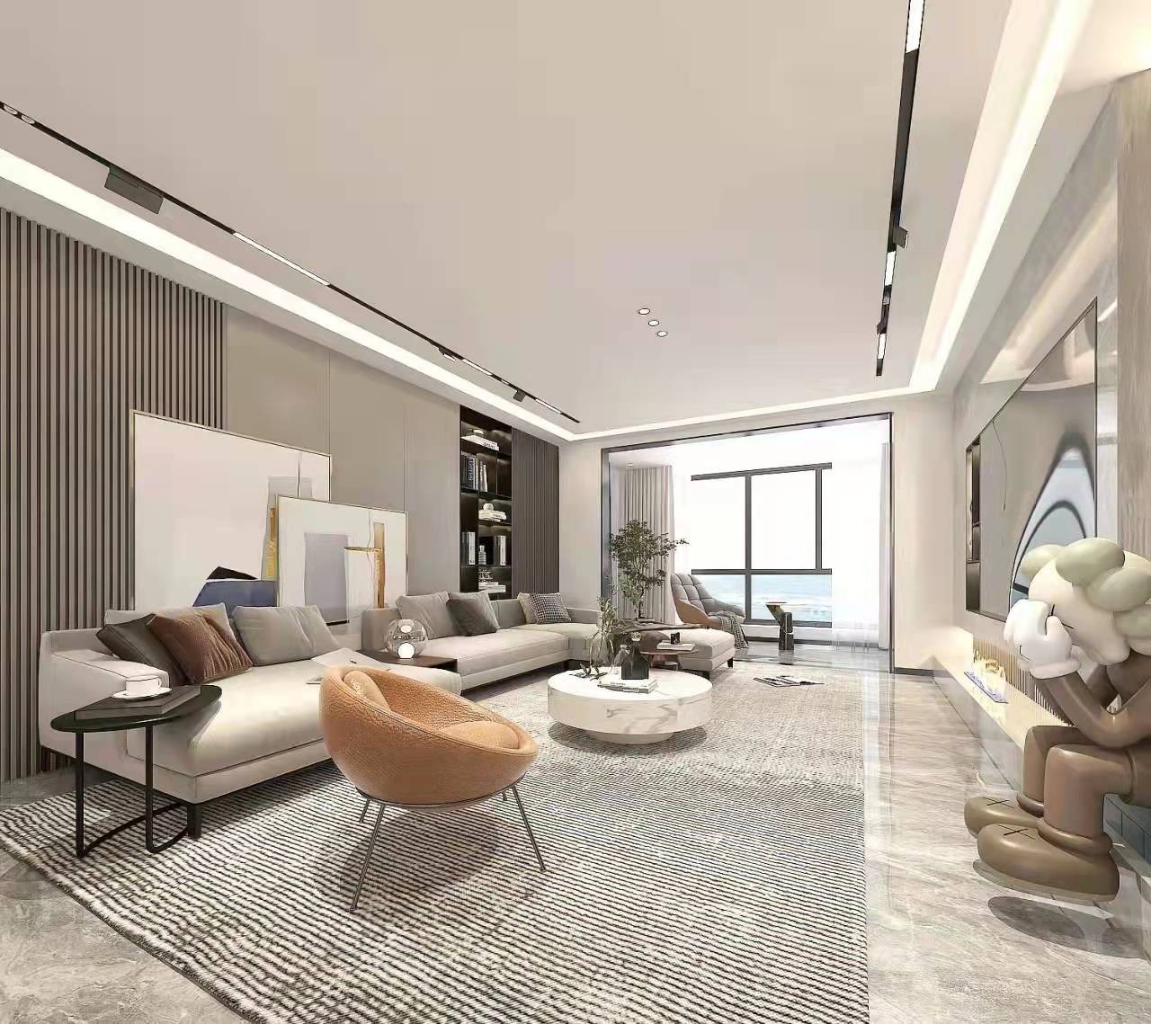 客厅主色纯净气质,少许亮色点缀营造视觉焦点,主色调用的是灰、白、浅驼、奶咖等中性色调,营造一种纯净而不失温馨的空间格调。