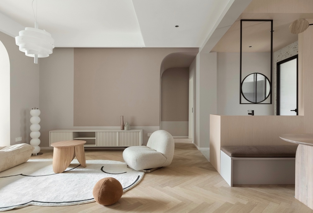 采用橡木地板以人字拼贴法落地,墙面上选择反差小、饱和度低的乳胶漆,打造温馨轻奢的主基调。