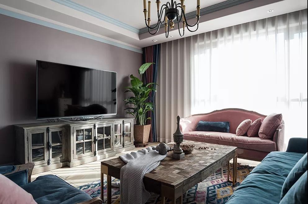 同样的紫粉色墙面复古融洽。