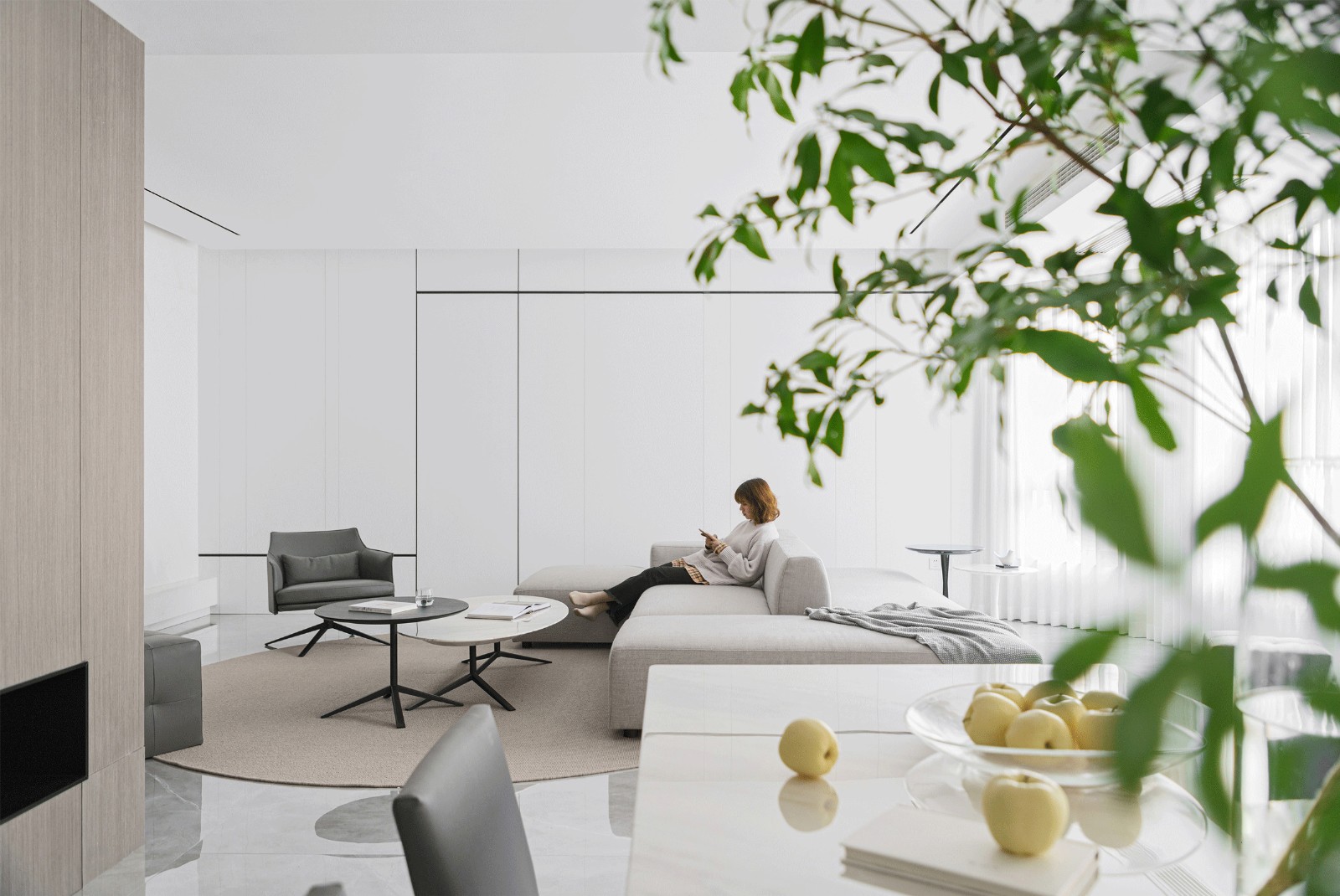 玄关处的入门视角线,在平面墙体上运用立面开洞的手法,做了一个黑色七字型壁龛,营造空间之间的局部互动。还通过方块空间的增设,构建出一道空间环境的虚实关系,近景暗色木饰面的实,远景白色墙板的虚,丰富了整个空间的层次。隐约有“复行数十步,豁然开朗”之感。