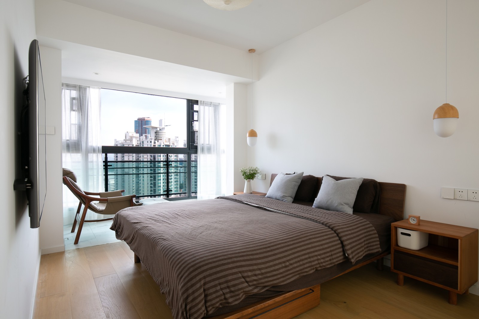 越住越大的家,一定是打哪都会体现***的收纳。主卧尽头是整面L型的柜体,门开中间,门后即柜体收纳,空间优化更显合理,而L型的柜体区,也可以充当衣帽间的功能。