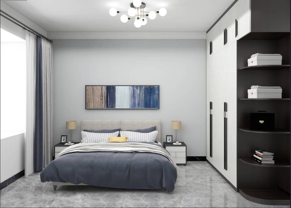 主卧空间内设计了整墙定制柜,满足业主的储物空间需求。