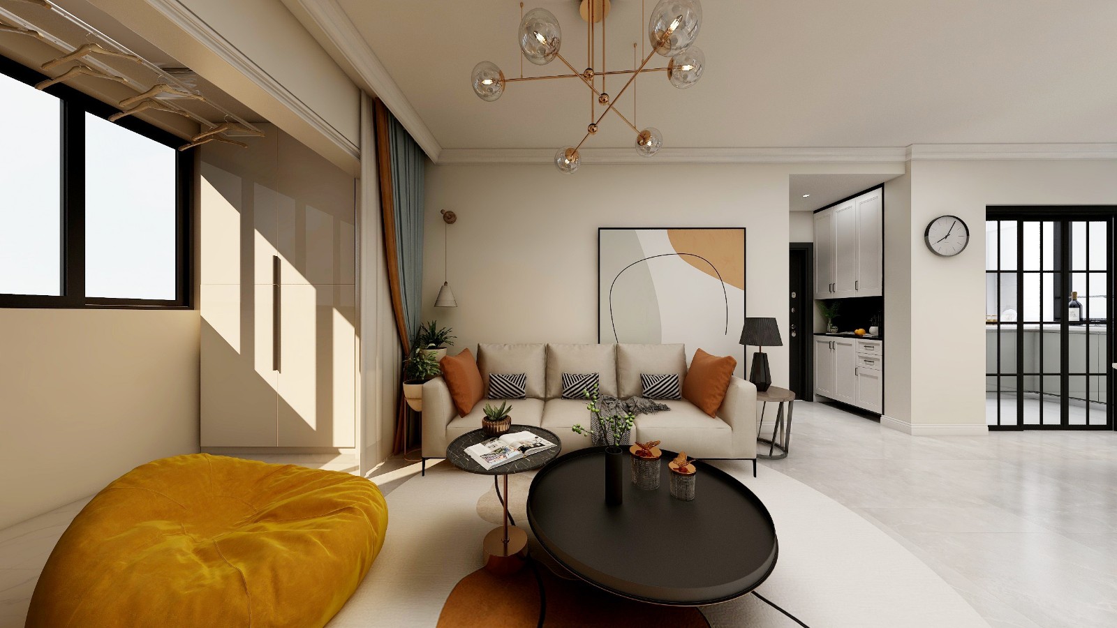 整体的颜色搭配比较简单,通过白色和黄色来构造出温馨、舒适的居住氛围