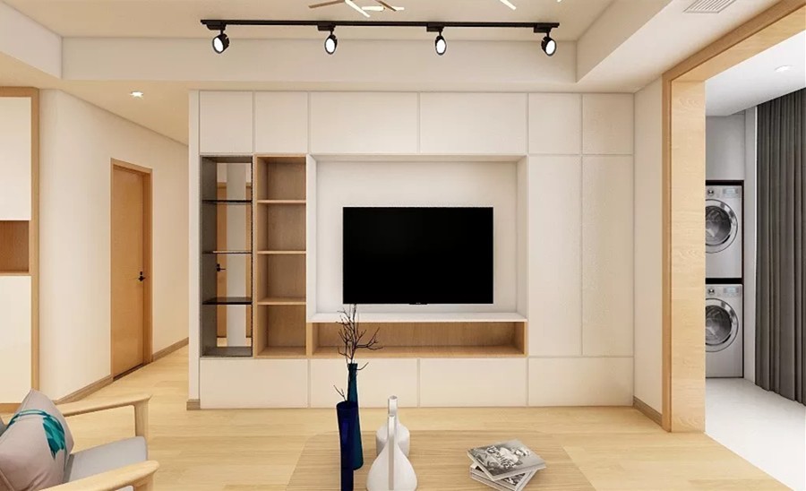 客厅电视背景墙和沙发背景的两侧的柜子有较少的开放格,电视机位置内凹,在与柜子统一凸出的地方藏入电视机背后的各种线路,使得整面墙非常的干净整洁;