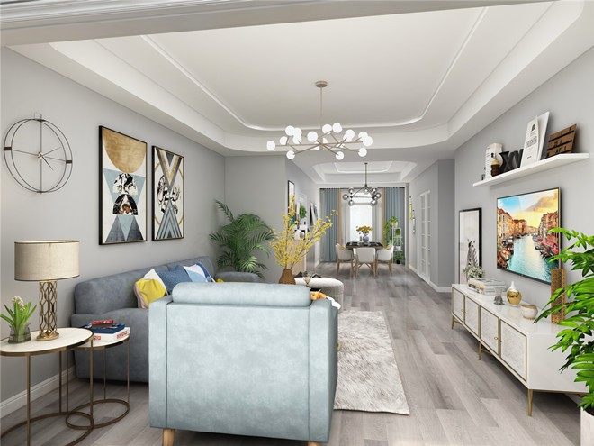 客餐厅墙面选用***灰艺术涂料,全房实木地板