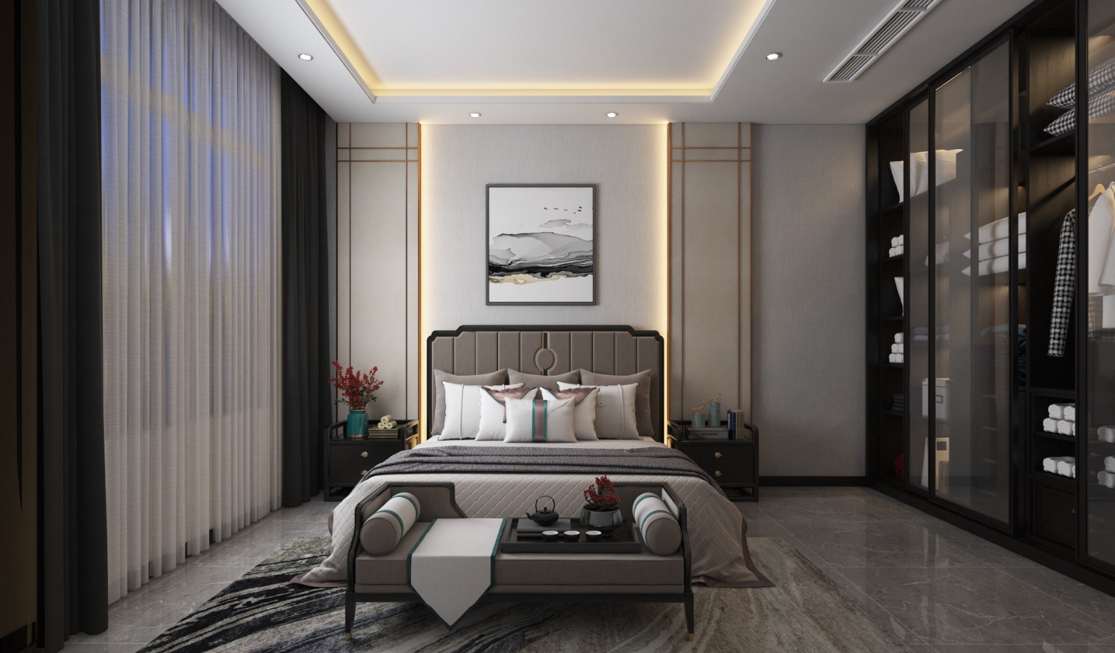 新中式主卧室的色彩一般选用安静、悦目、舒适、沉稳的格调,用色一般一淡雅、别致的色彩为主,创造出柔和宁静的气氛。