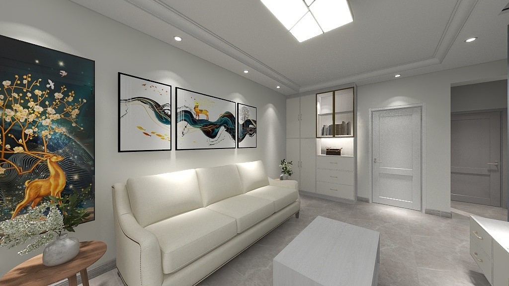 客厅浅灰色地砖搭配灰蓝色背景墙,简约大方,配上奶白色沙发,温馨浪漫