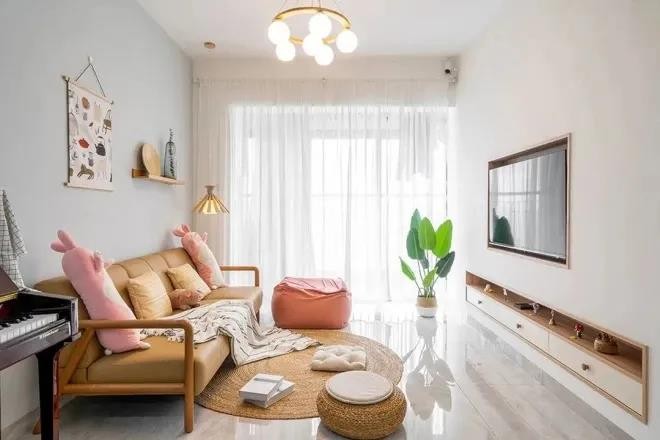 客厅全景,温柔不失自然。浅灰色与木质色彩叠加,营造了温暖舒适的居家氛围。客厅阳台连通,采光和通透性得到了很大的改善,慵懒的午后躺坐在珊瑚红豆包上,享受舒适惬意。