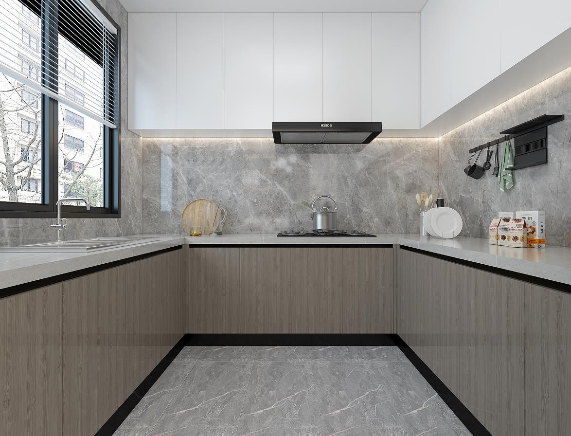 厨房橱柜U形,吊柜底置灯光简洁明亮,提升档次及便利性。