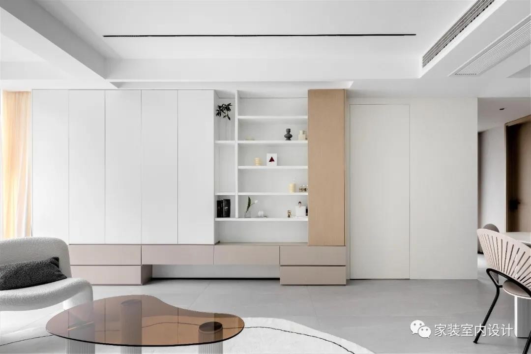将南北阳台并入室内,扩大公共区域面积,视觉上显得明亮宽敞。用整面收纳柜代替传统电视墙、用通天玄关柜打造独立的玄关空间、将洗漱干区和家政区安置在走廊……留出足够的收纳空间的同时,优化动线,提高生活效率和便利性。