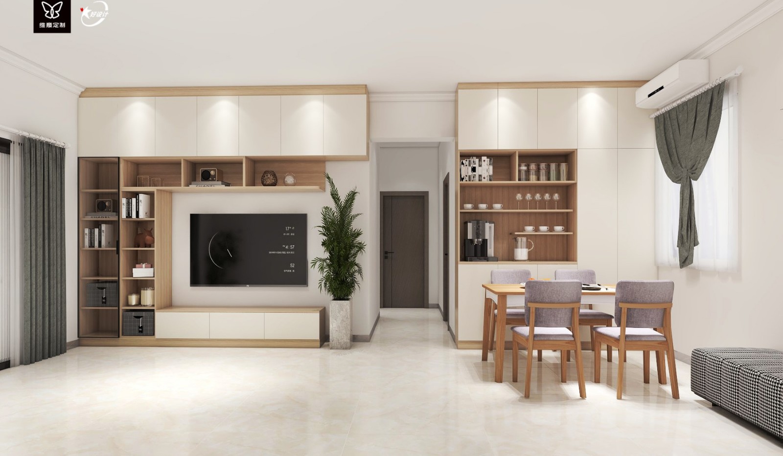 客餐厅设计了整体的电视柜和餐边柜,色彩为木色搭配白色面板,整体简约大方,干净。
