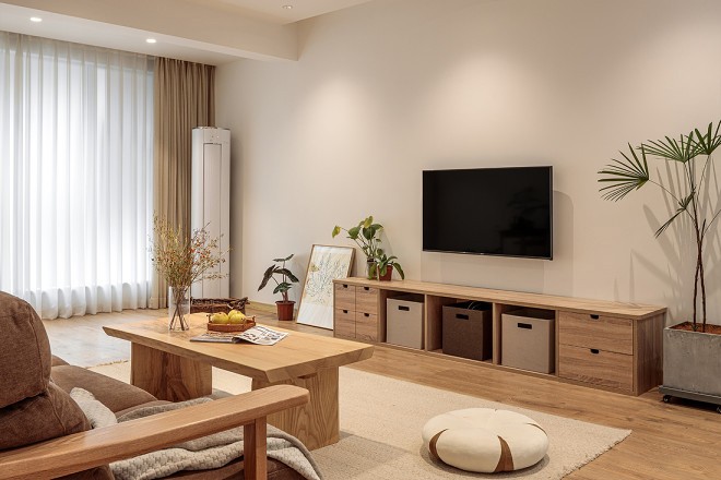 公共空间形成以客厅为核心的LDK空间模式,以日式原木为基调搭配全屋储物柜、木地板、以及各个实木家具。