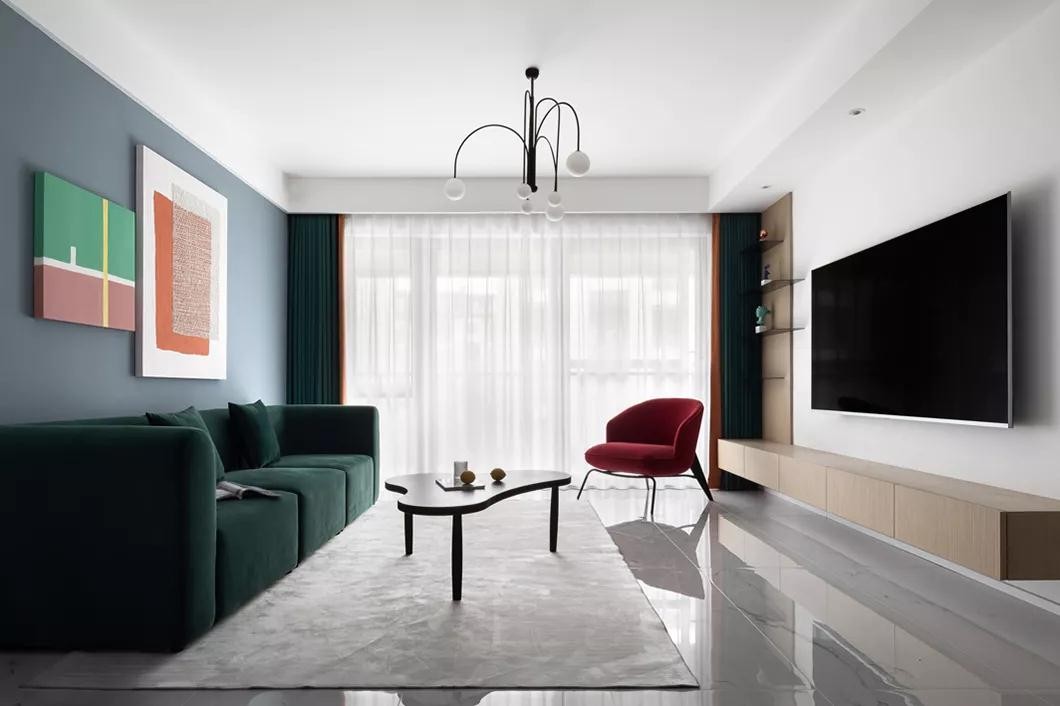 蓝色是博大的色彩,也是永恒的象征,它可以承载一切颜色。所以在这里,设计师则大胆运用绿色和橙色相接的装饰画来进行跳色,搭配深绿色沙发等,彰显色彩的魅力。