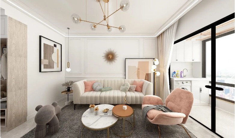 1.客厅顶面石膏线条做装饰增加楼层高度 2.乳胶漆颜色采用了暖色调温馨大气