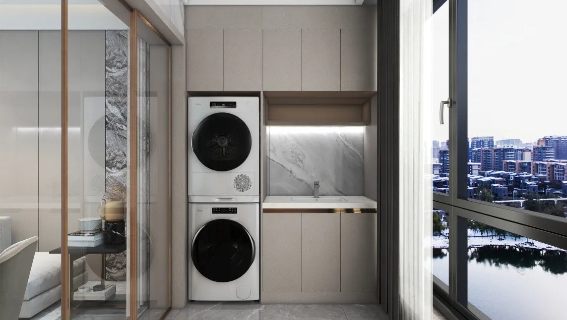 阳台采用了高低柜 . 洗衣机给烘干机合二*** 减少空间浪费