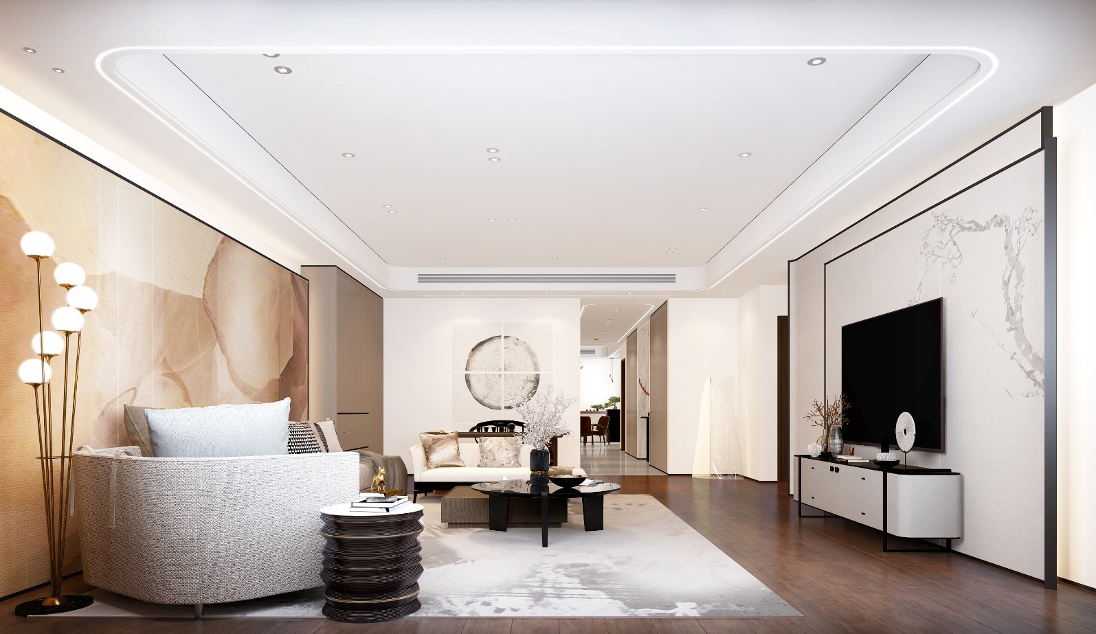 50平超大客厅,皮革硬包沙发背景,大理石电视背景搭配木地板