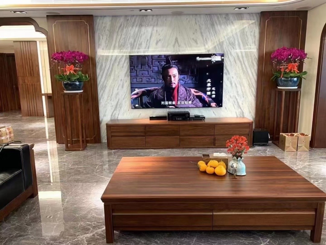 客厅电视墙采用了石材纹路色给装饰板应用了深色撞色选用软装做搭配使的中式空间更具体
