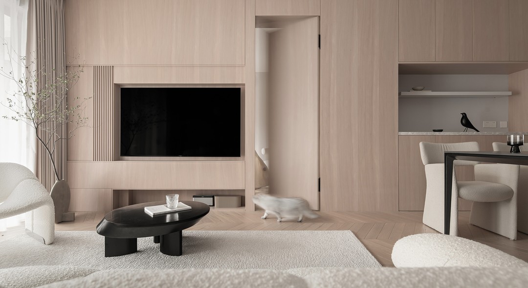 整个空间中软装上我们选用软萌低矮的家具来增加空间感,色彩柔和平静,有秩序的木格栅作为点缀,形成直线和流动间的对比。当一件件家具落实到空间里的时候,阿秀说,她只想呆在这个安静的空间里喝奶茶看电视,看着陈胖胖干活,和朋友聊天。