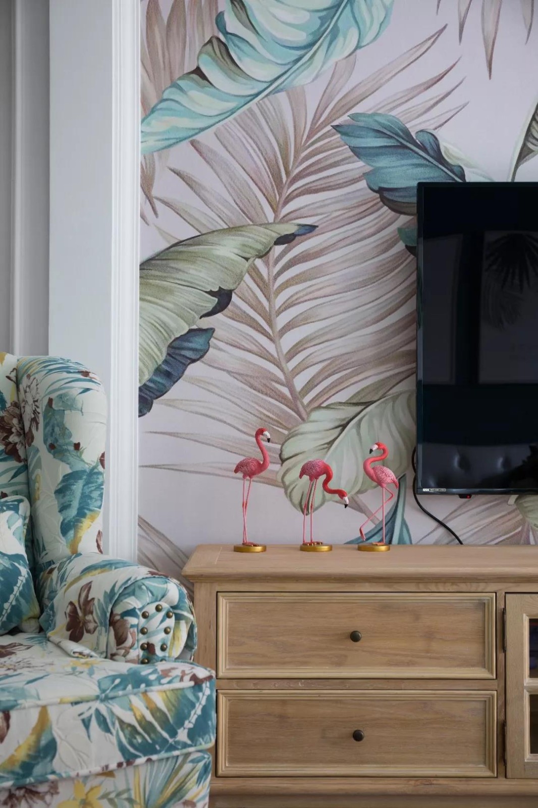 电视柜上还摆放了几个火烈鸟的装饰品,让客厅多出了一些活力感
