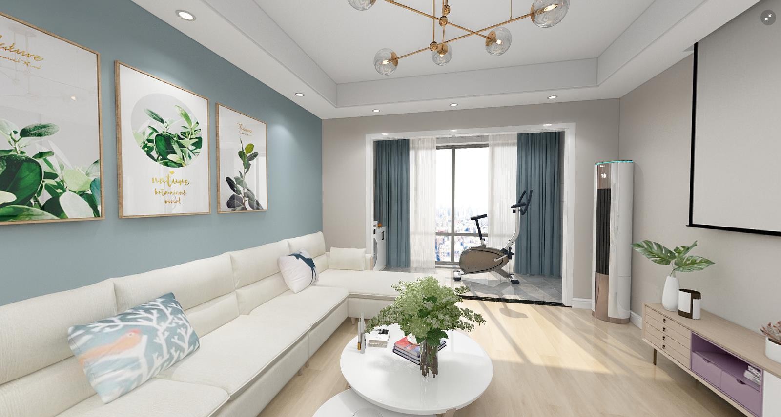 蓝白色调的客厅与生活阳台相连,实用美观,可以作为简单的健身区。