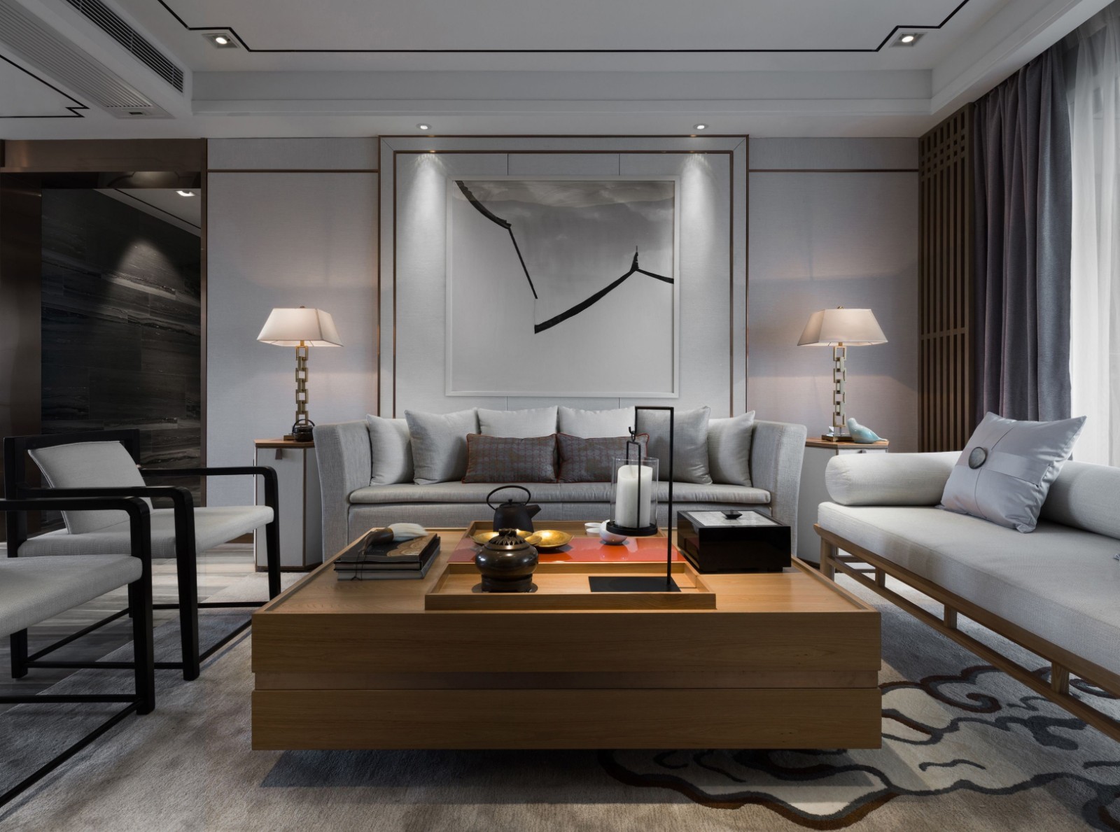 江南的生活是写意的,日子可如行云流水般畅快而轻柔,借鉴古时江南的这般简朴与诗意,来构建一个现代生活的现实梦境,是可追求的,可到达的。 不同的颜色、线条和笔触把居室的不同空间描募出了春冬两个季节的别样风光,仿丝和粗麻更是体现了喜好自然舒适的朴素情调,是现代生活中的自然江南景色,拉丝暗古铜的四处装点象征一种精致的追求,崇尚简朴而不粗糙,有江南人家的细腻。 客厅拥有轻描淡写的情绪,大理石上水墨色的色