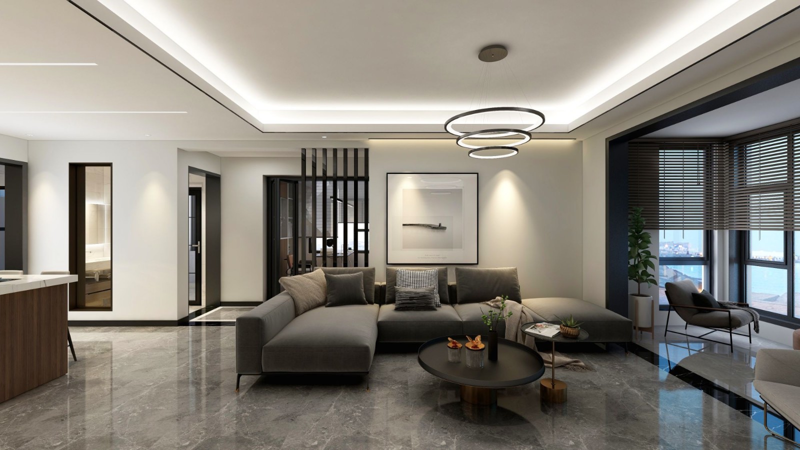 客厅: 整个客餐厅空间为一个竖厅的形式,包括我们电视一面有我们主卧的门,所以在设计时把我们的主卧门融入整个电视墙以及餐厅酒柜一面,电视墙才用浅灰色的格栅条搭配爵士白的瓷砖柔美优雅的结合,同时浅灰色的格栅凹凸造型让空间得到一个视觉延伸