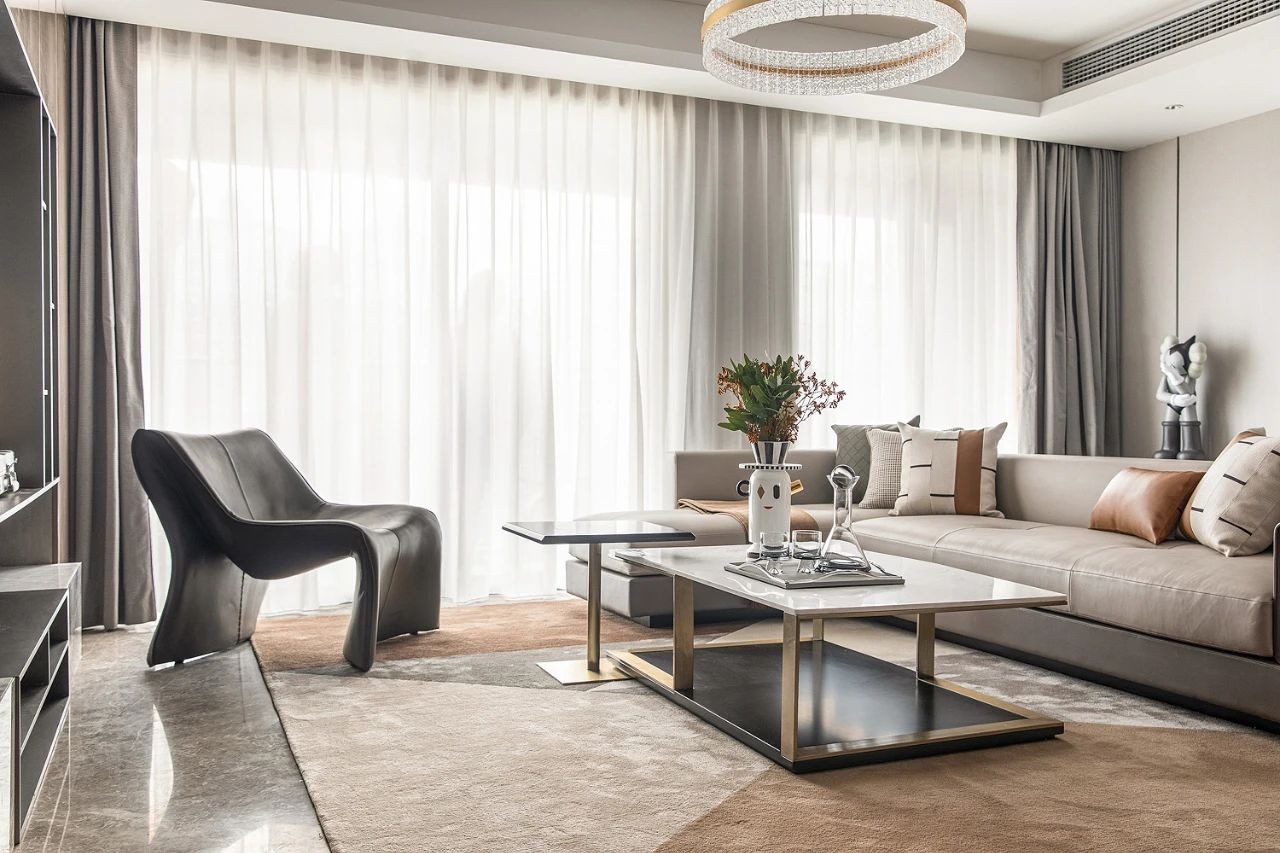 客厅一改传统模式,开放式餐厅与休闲区融为一体,消隐了不同区域之间的边界,不仅满足家庭日常的社交需求,多重空间之间也得以自由切换。