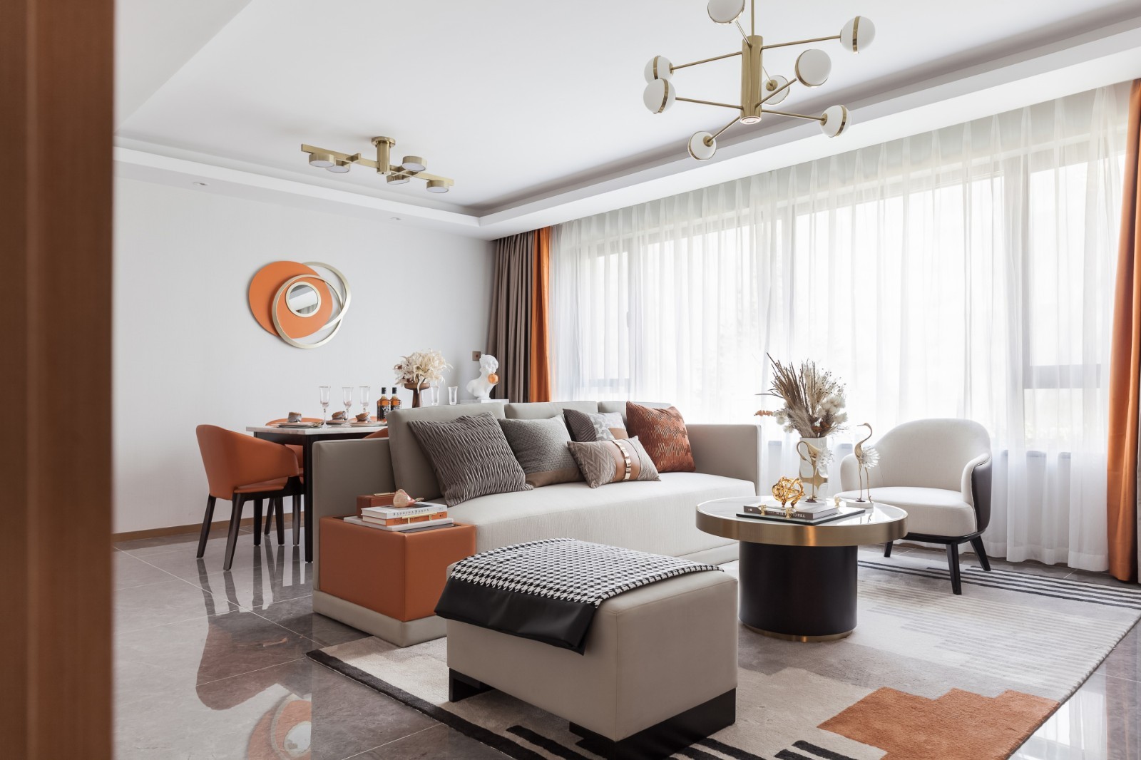 一抹橙色唤醒了空间的活力,使整个空间细节更加缤纷,温馨典雅,金属线条的对比,勾勒出空间质感,营造轻奢感之余,带来丝丝生活气息,悠然其间~~