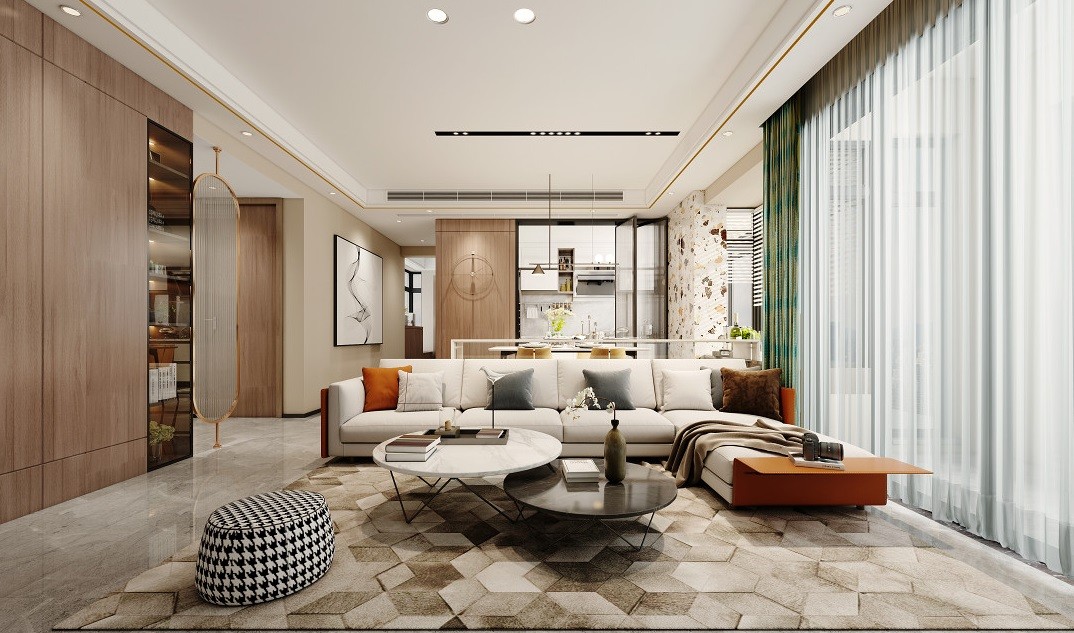 L型沙发搭配黑白配色茶几,辅以菱形格纹地毯,摩登风格呼之欲出