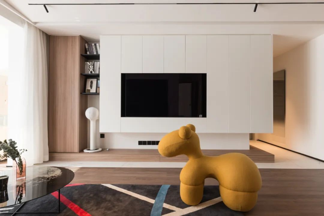 电视墙在装饰效果之上加入了储物及展示的功能,并留出L型的空间凹槽,避免视觉上过度的饱和感,并与进门处的白色鞋柜衔接。 木色地台转角与角落的木色储物柜的联通,自然而然的提升了整个空间的延伸感。