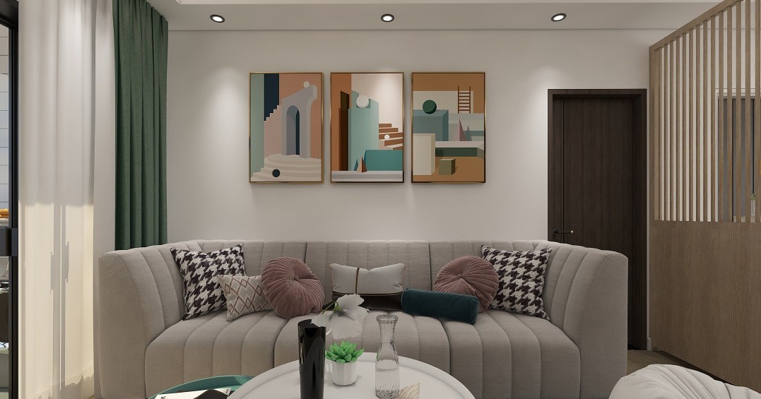 白色墙面、桌面,给人感觉整洁干净,原木材质的屏风让自然又走进了家中,灰色条纹沙发搭配不同款式花纹抱枕,舒适温馨;墙上挂画颜色明快活泼又带着清新,金属边框装饰得挂画更加有质感、有厚度。