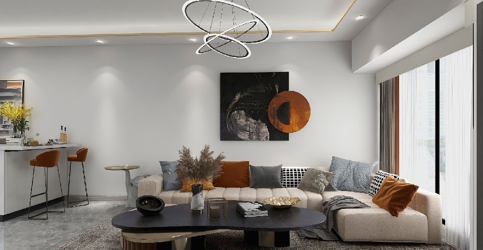 业主想要在客餐厅大区域里采用金属边条,为满足需求,天花吊顶采用金属线条来勾勒,软装上使用现代风形式的家具进行搭配,用一些橘棕色色调家具点亮空间,增加色彩。