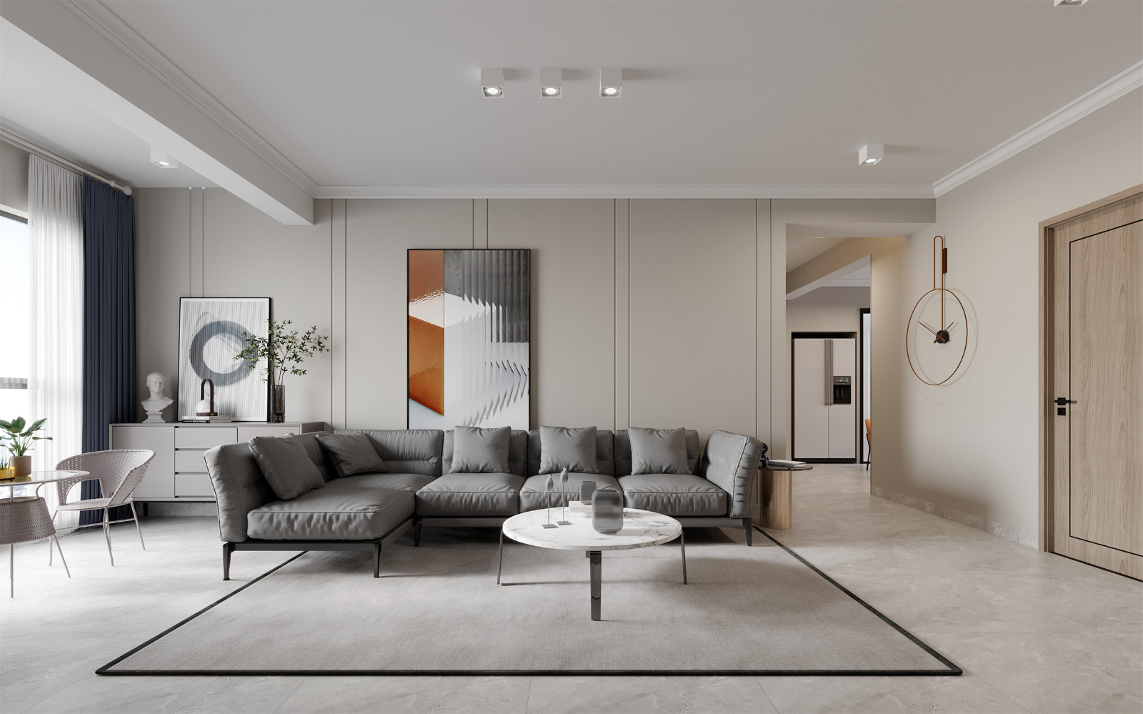 本案是一套108㎡,定位现代风格,整屋被设计师利用简单的颜色在空间上进行贯穿,让整个空间变得更加整体化,极简的设计理念展现屋主对生活的态度。浅灰配色与木质纹理进行相互搭配,突出整个空间当中自然温和的风格,流利的线条再加上一些极简的家具,让整个空间具有了家的温馨和舒适。