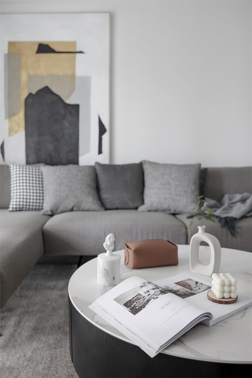 白色茶几与电视墙相呼应,自然的纹理精致美观,艺术造型的花瓶摆件彰显屋主高雅的品味与格调。