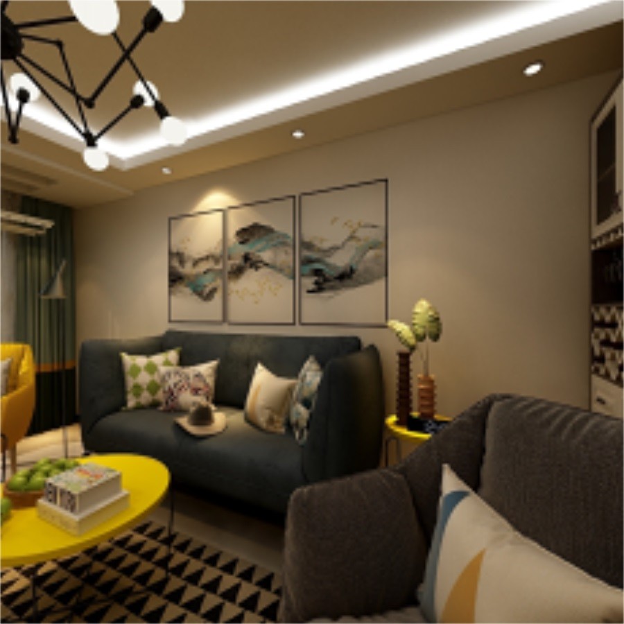 灰色沙发搭配明亮黄茶几,庄重感中增加点俏皮感。整体很协调