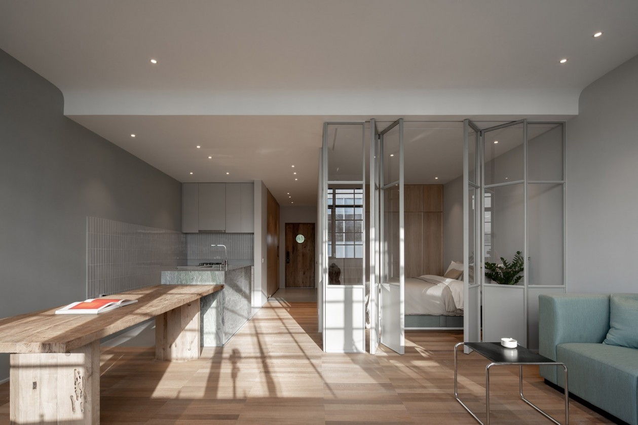 卧室采用了细框铁艺玻璃折叠门,休息空间与活动空间融合在一起,使之拥有与客厅同等质量的自然光线。折叠门的卧室一侧安装了窗帘, 保证了空间的私密可能性。玻璃门延续至转角,虚化转角处的视线感受。