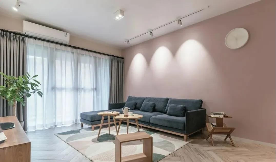沙发背景墙刷一面粉色的乳胶漆墙面,用灯光与挂钟修饰