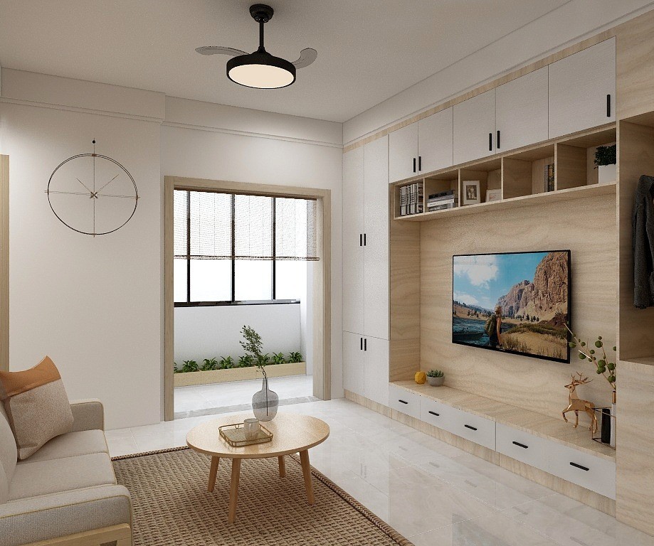客厅定制一整面储物柜,临近门口位置设置开放格,更方便使用。