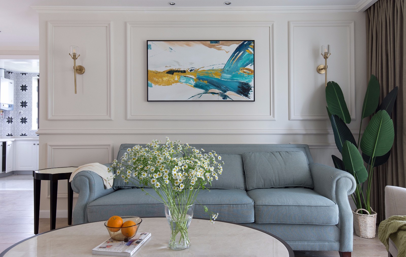 沙发背景墙采用护墙板做的造型,黄金比例分割区域。