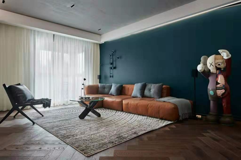 客厅的背景是深蓝色,放置了一个橙色的皮沙发,色彩明度拉的很大,但是却异常和谐。