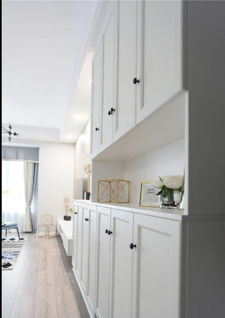 玄关左手边有通顶玄关柜。白色的鞋柜,为一家三口提供了充足的储物空间。