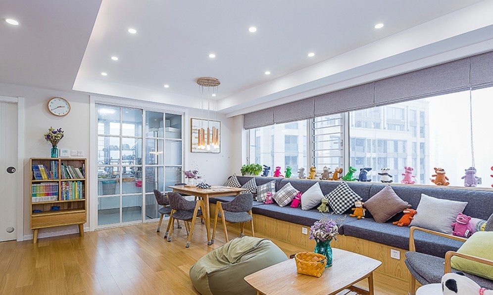 没有正式客厅,直接运用大型飘窗做沙发,容坐率更高,休闲性也更强;木板上铺灰色坐垫与靠背,灰与木的冷暖色系结合,共同打造出和谐的会客空间;
