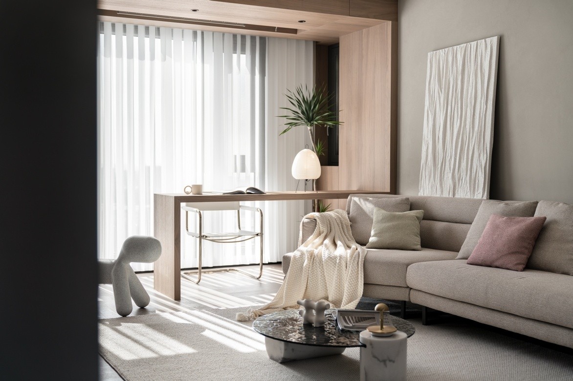 仿清水泥灰肌理的质感透着沉稳和自然,没有任何造型,相比过于繁复的装饰、丰富的色彩,轻松而宁静。