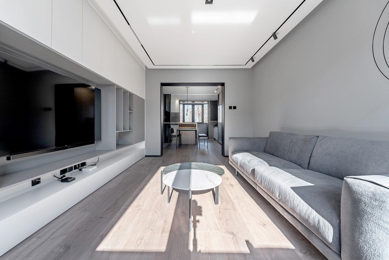 客厅整体选用了经典的黑白灰三色进行搭配,营造一种简约干练的现代风格。南向的格局让空间有一个良好的采光效果,让空间整体可以保持一个温馨舒适的家居氛围。