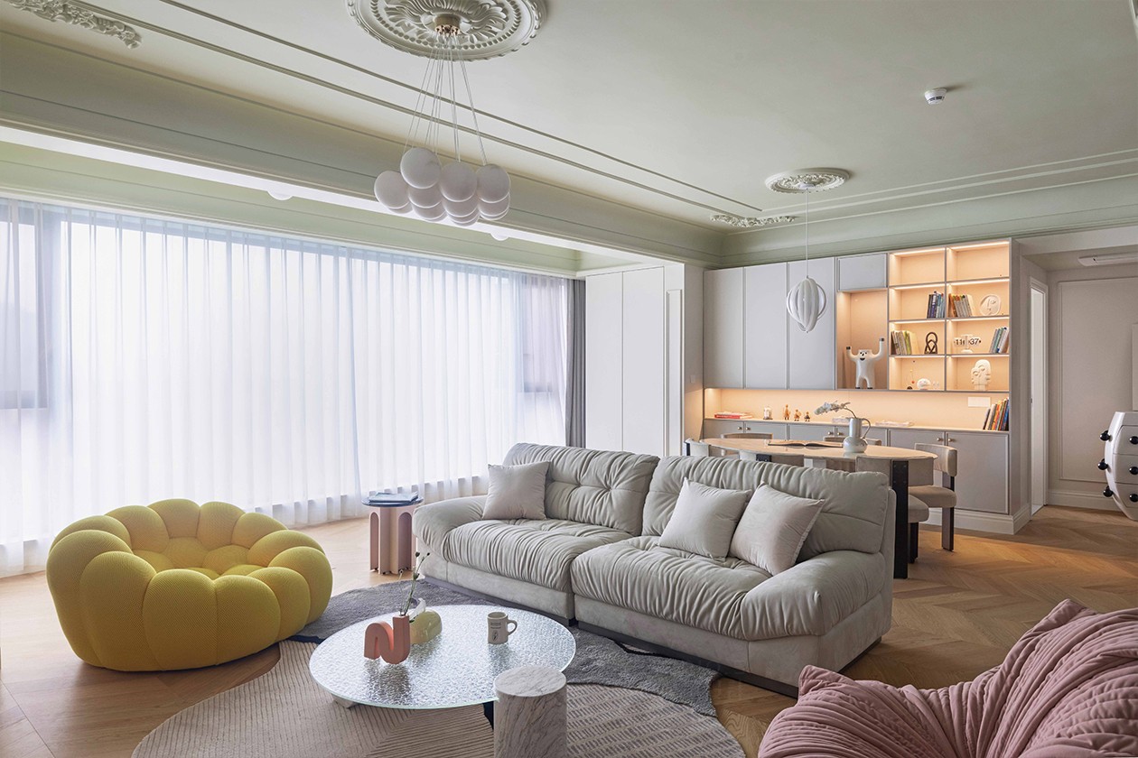 法式的优雅融合现代的简约,一半是***一半是温柔浪漫,考虑到屋主家有一个小baby,在色彩的选择上会更加丰富,明黄色搭配橡皮粉的单人沙发也给这个家带来温馨的回忆