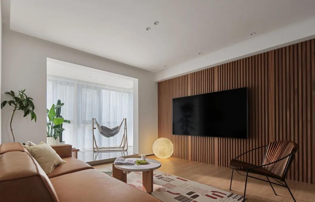 电视背景采用木格栅的形式,整个背景形成一个整体,也通过格栅弱化房门让次卧完美“消失”。