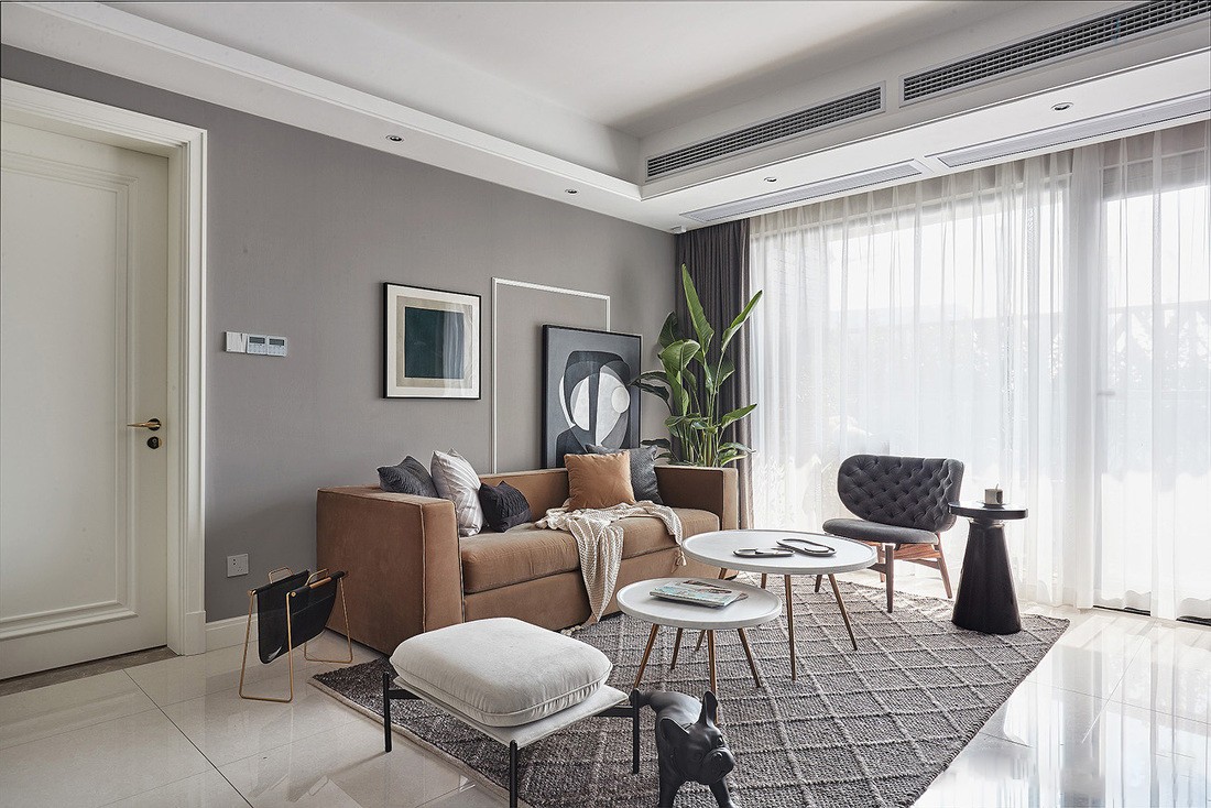明亮的采光无疑像一道强劲的柔光滤镜,秩序感和偶尔的线条融入,使空间的一切配色都恰到好处,白色与黄铜色结合的茶几,搭配精致小摆件,绿植的点缀,满满的自然气息,慵懒的单椅靠近窗边,享一抹阳光,品生活的惬意与美好。