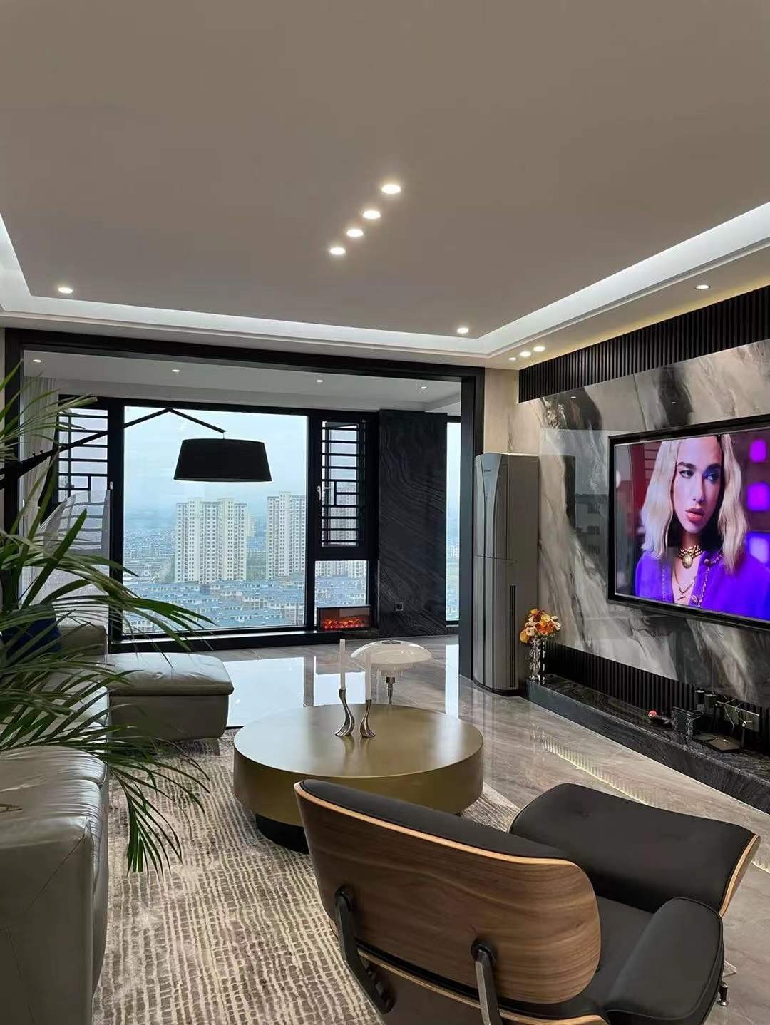 客厅的弧面波浪纹大理石增加了客厅的特色感,旁边的深色硬包缓和了大理石的冰冷感,加上现代经典的弧形沙发,整个空间非常大气。